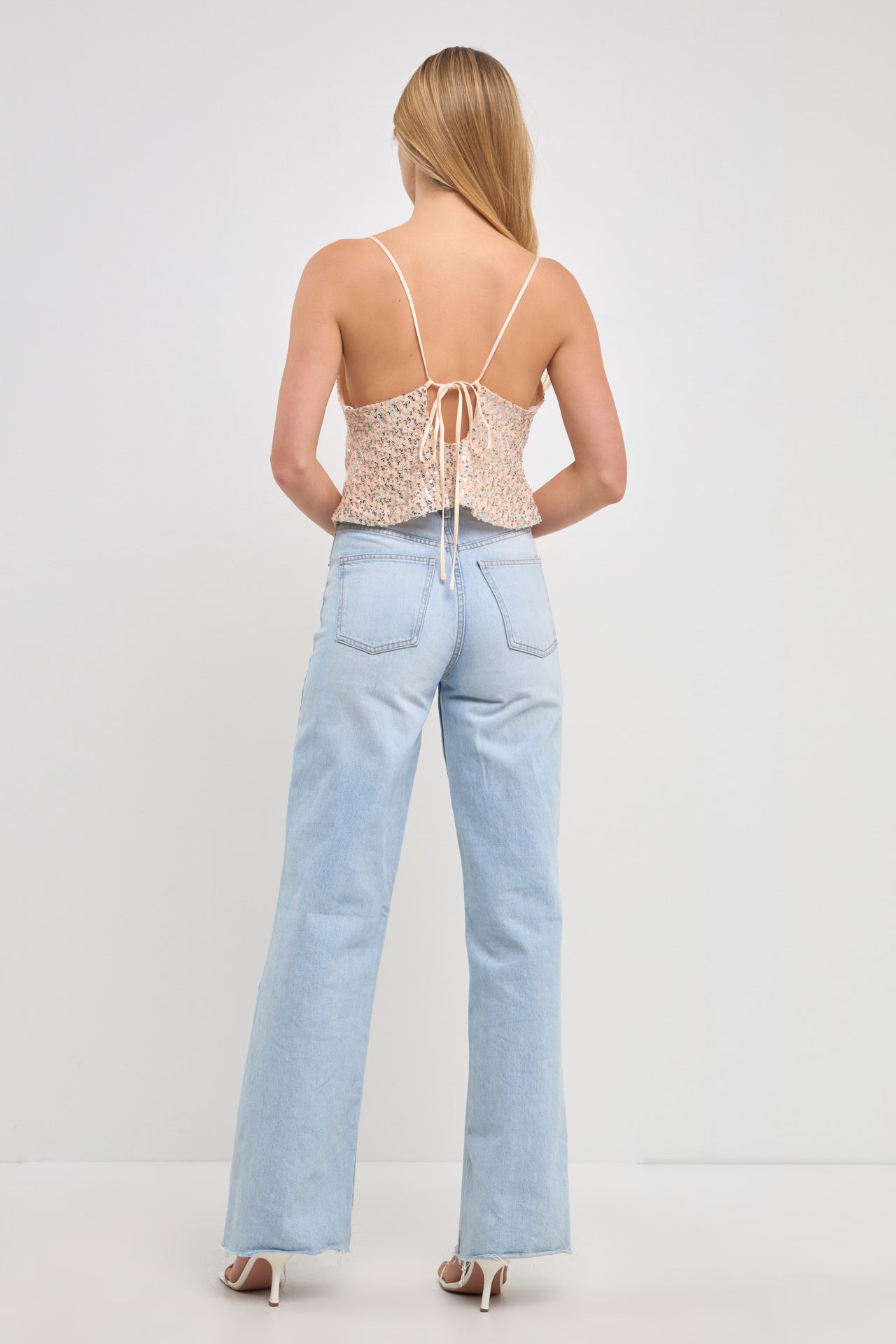 Shine all night in this dazzling sequin top. This top is perfect for your next special event. With a cowl neckline and back cross tie Detail, it's sure to make you stand out from the crowd.