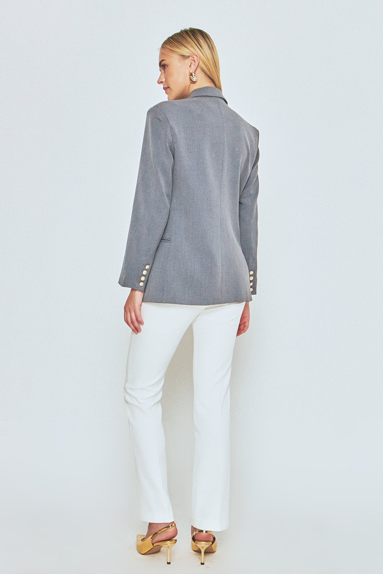 - Sleeves feature decorative mini gold buttons