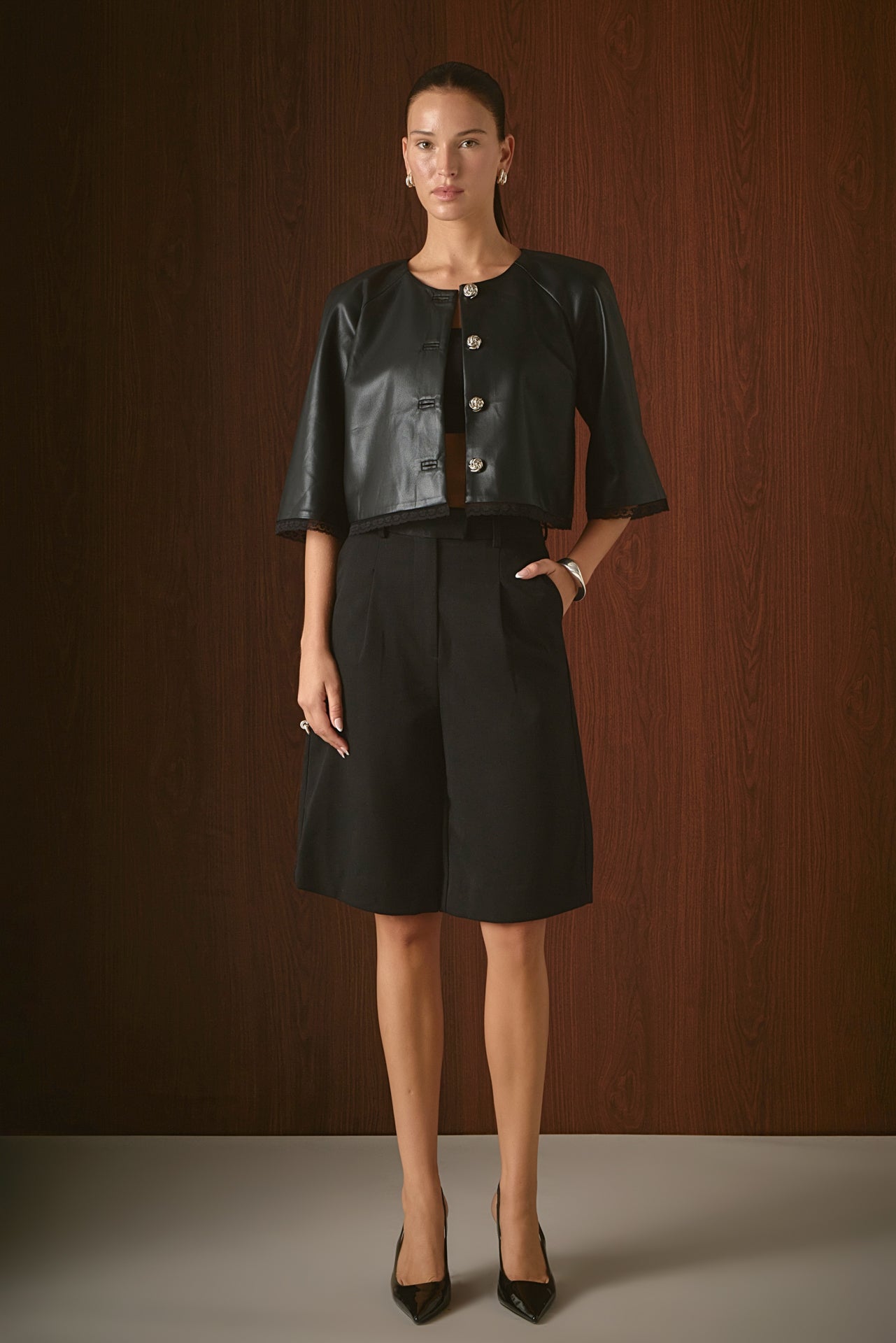 Elevate your wardrobe with our stylish Faux Leather Cropped Jacket. Crafted from high-quality faux leather, this jacket boasts a trendy cropped length and front center buttons for a fashionable touch. The jacket features functional pockets for added convenience and versatility. Perfect for any occasion, dress it up or down for a chic look. Our faux leather jacket is a statement piece that will enhance any outfit. Grab yours today and make a fashion statement!
