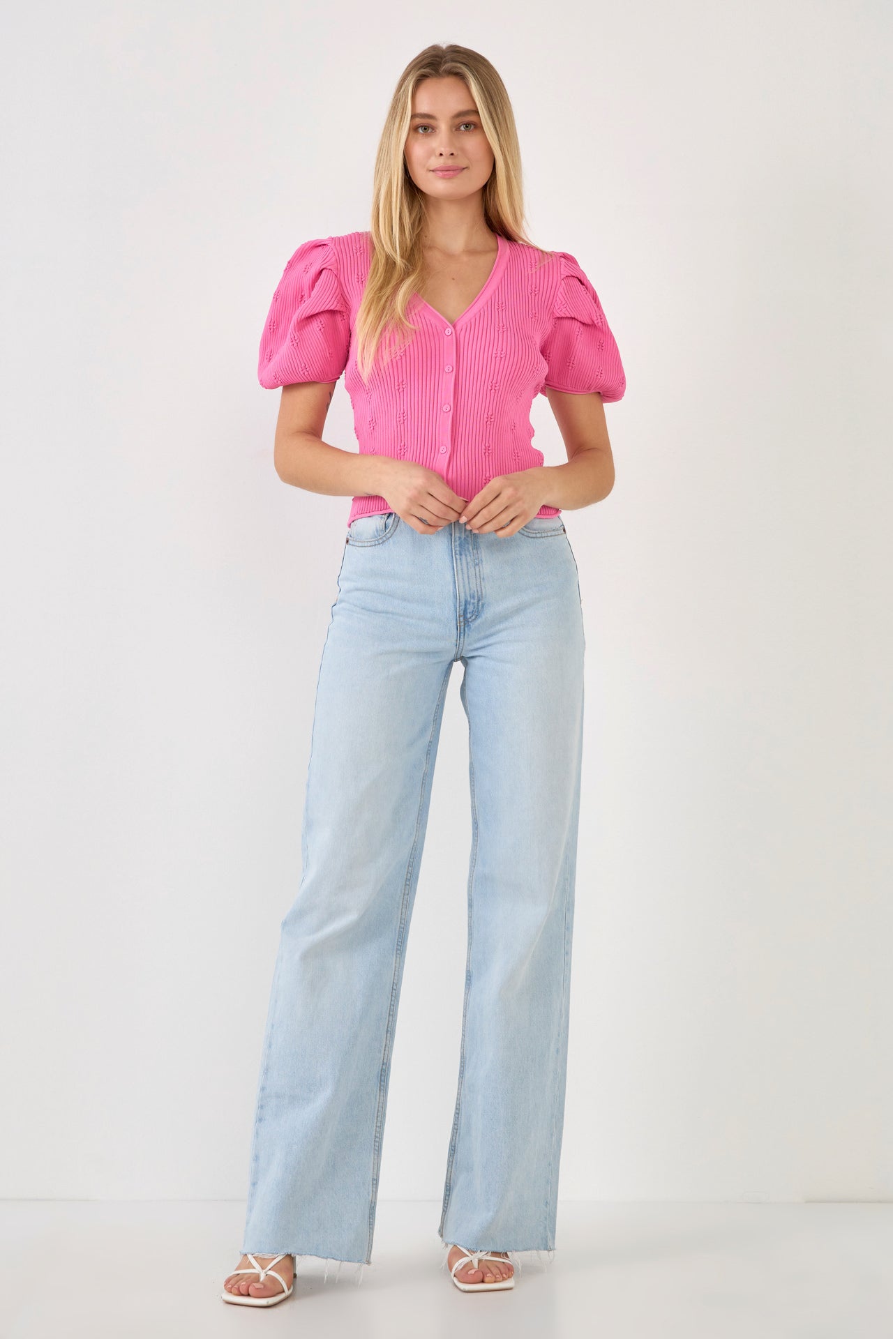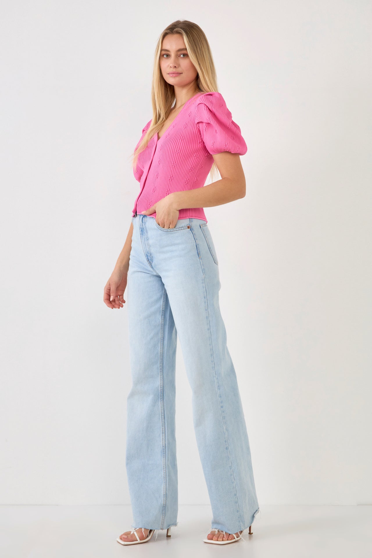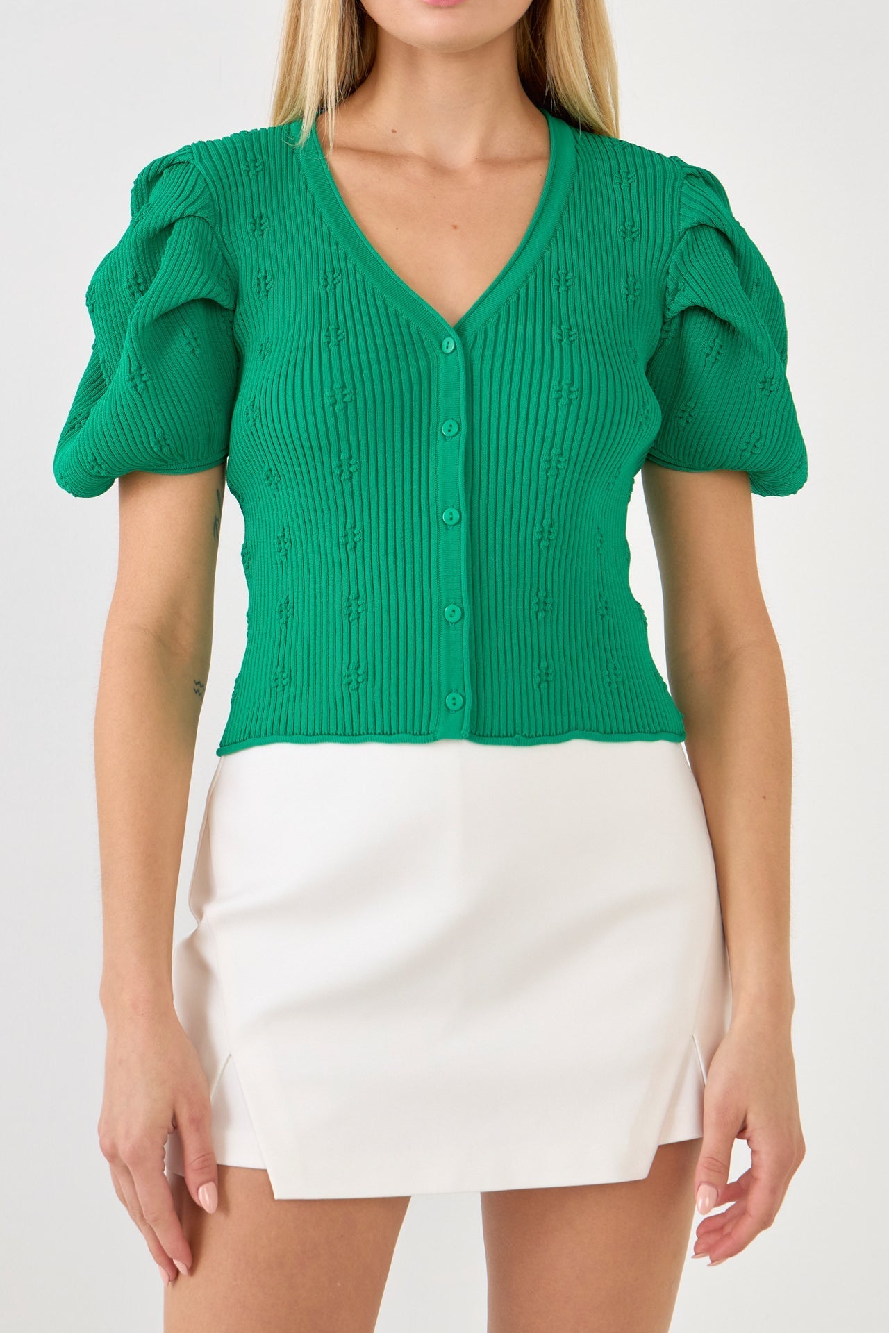 This pretty cardigan is perfect for transitional weather. With its demure floral print and short puff sleeves, this textured knit cardigan will keep you cozy all season long. The v neckline and center front button closure add a touch of elegance, while the fold detailed shoulder gives it a bit of character. Whether you style it with jeans and a tee or dress it up with a skirt and blouse, this cardigan is sure to become a go-to in your wardrobe.