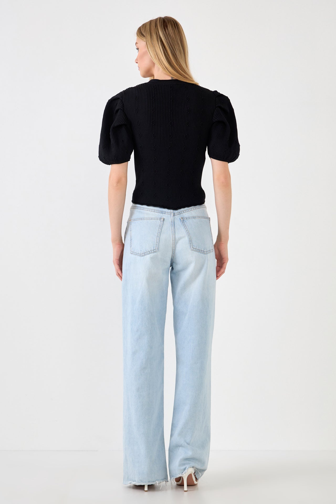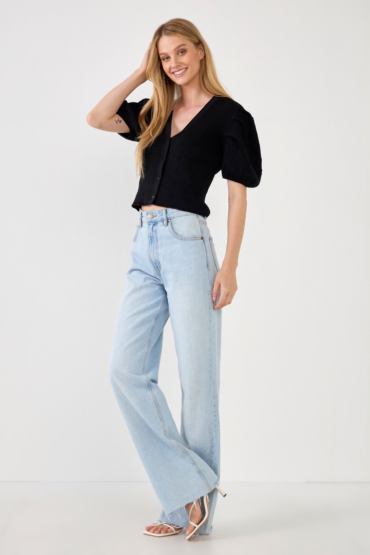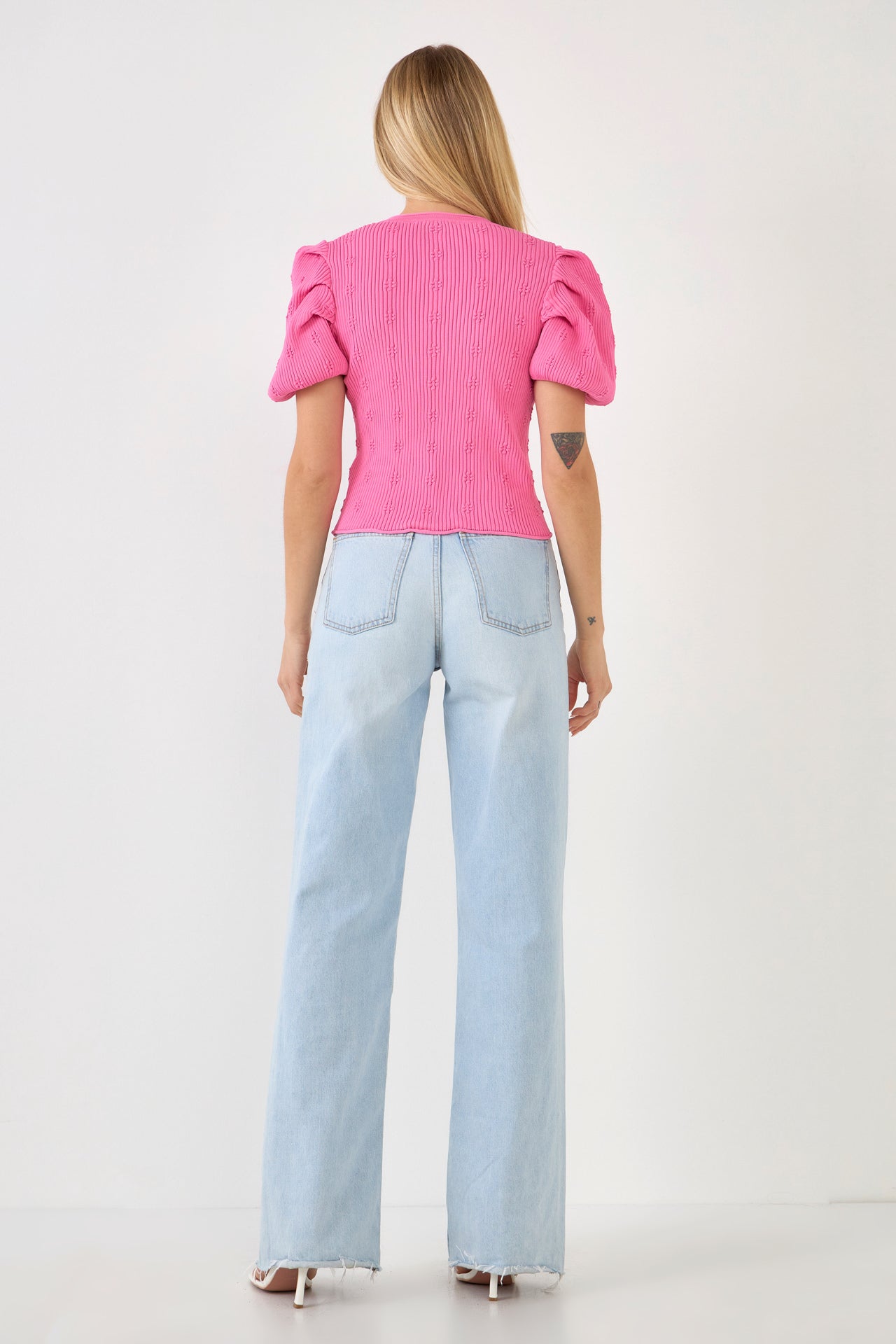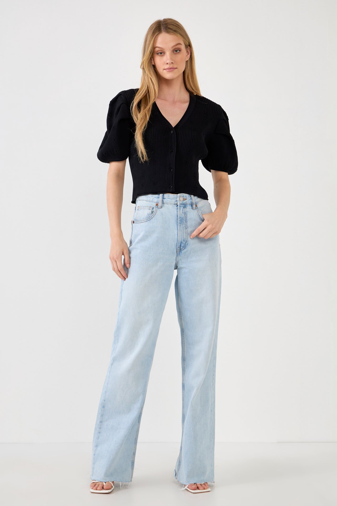 This pretty cardigan is perfect for transitional weather. With its demure floral print and short puff sleeves, this textured knit cardigan will keep you cozy all season long. The v neckline and center front button closure add a touch of elegance, while the fold detailed shoulder gives it a bit of character. Whether you style it with jeans and a tee or dress it up with a skirt and blouse, this cardigan is sure to become a go-to in your wardrobe.