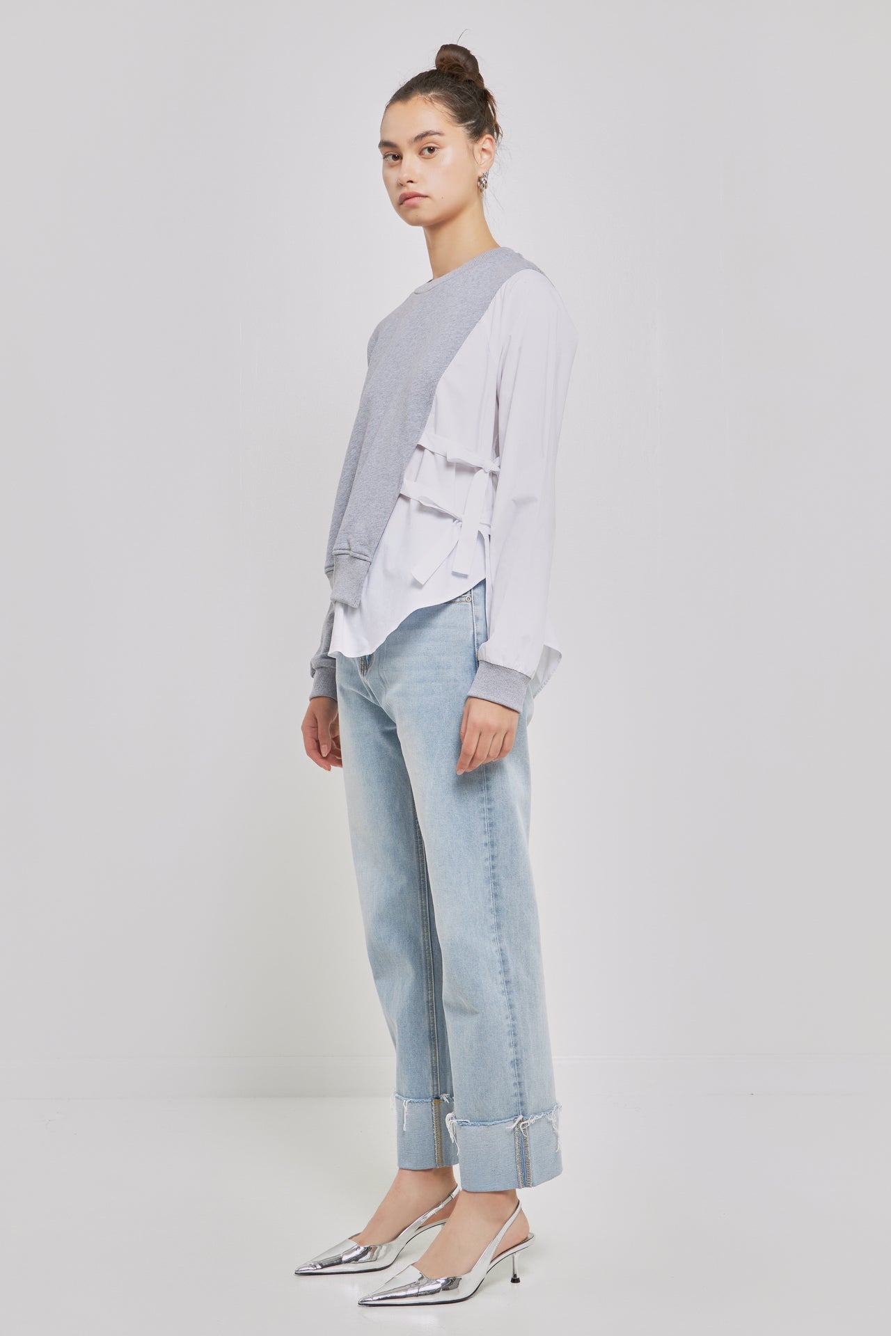 Our Mixed Media Sweater is a unique hoodie &sweatshirt that brings a fresh, asymmetrical style. The long sleeves are highlighted with a tie detail to add an extra flair. It is the perfect choice for those looking for a modern style and is sure to make a statement. No matter the occasion, it is an excellent conversation starter that is sure to draw attention when you wear it. Our Mixed Media Sweater is sure to stand out and adds a touch of style any wardrobe.