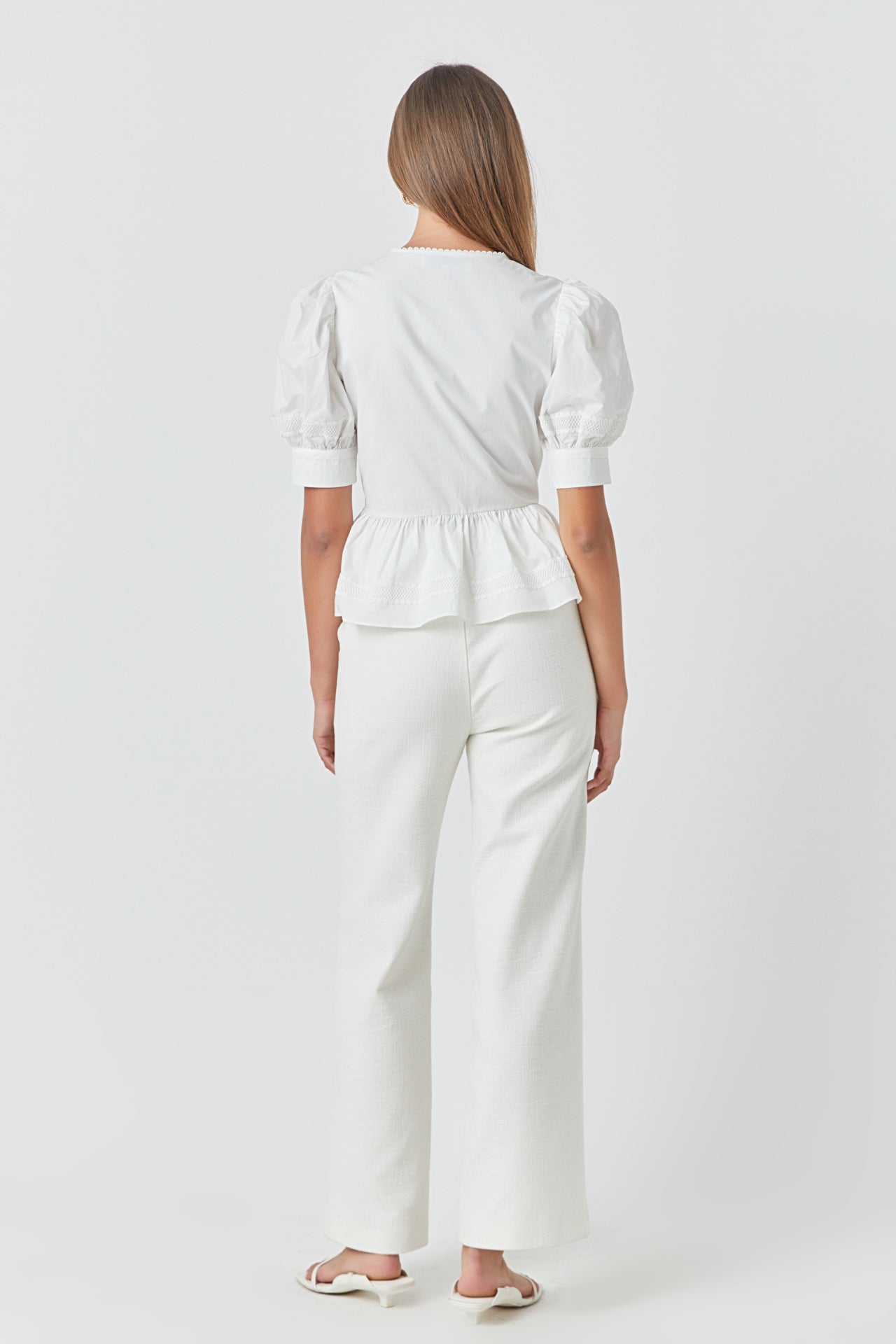 Give your style a sweet update with our Placket Lace Trim Baby Doll Top. Who doesn't love a little lace trim? This top features feminine details that will add some sweetness to your look. With a puff short sleeve and cuffs, it's perfect for hot summer days. Pair this top with a skirt or jeans for an effortlessly chic look.
