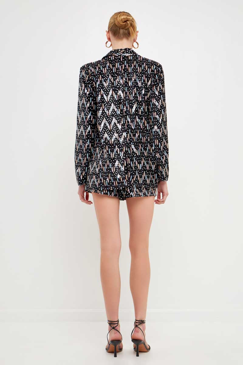 Everyone needs a fun Sequin Blazer in their closet, including you! This blazer is unique because it's created with velvet fabric that features multicolored sequin embroidery in an eye-catching chevron pattern. You can pair this blazer with the matching shorts or layer it on top of your favorite mini dress  to spice up your look. Regardless of how you style it, you're sure to be warm and fashionable!
