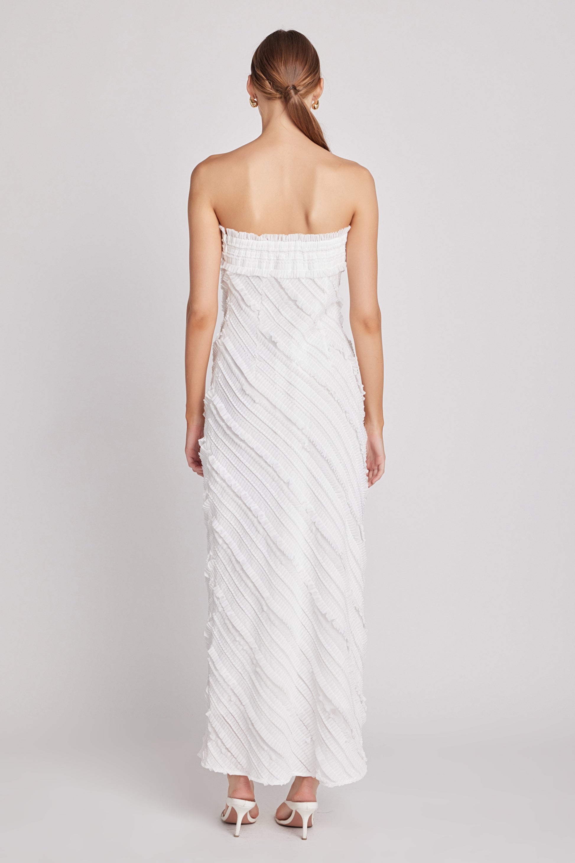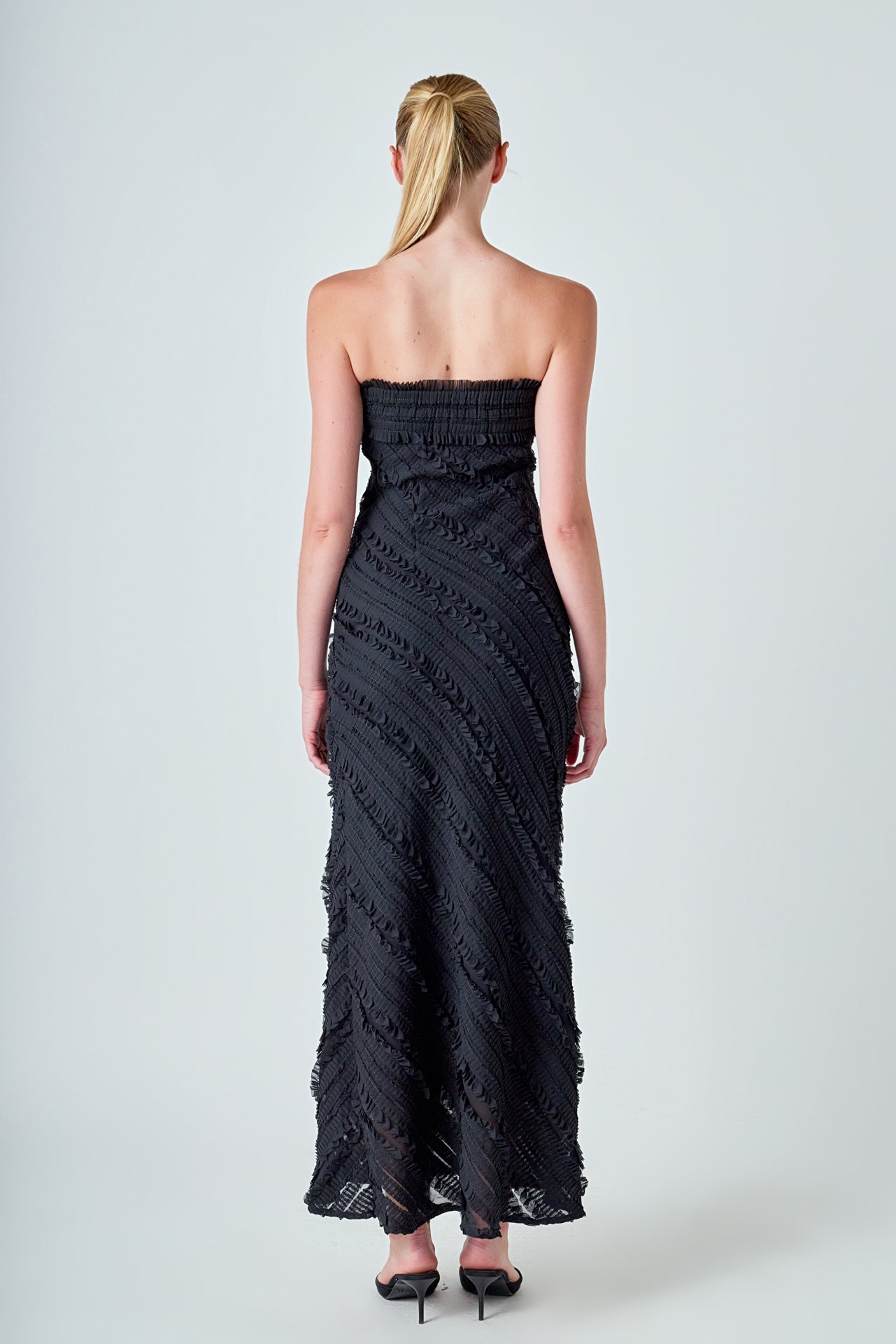 Introducing the Strapless Ruffled Maxi Dress, an effortless expression of grace and femininity. It is crafted from pleated chiffon and features delicate ruffles and a flowing maxi length. The bias cut flatters the figure with a soft, draped silhouette, while the strapless design adds a striking, modern edge. Ideal for weddings, summer soirees, or any special occasion, this dress promises to make a lasting impression.